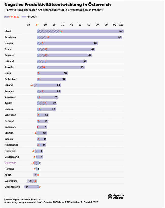 Eine von Agenda Austria veröffentlichte Grafik zeigt, dass Österreich damit im europäischen Vergleich auf den hinteren Rängen liegt. Während Länder wie Irland, Rumänien oder Litauen teils deutliche Zuwächse verzeichnen, gehört Österreich zu jenen Ländern, in denen die Produktivität seit 2019 zurückgegangen ist.
