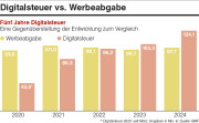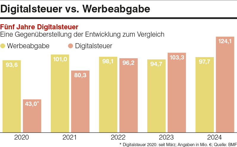 Seit dem stiegen die Einnahmen aus der Digitalsteuer weiter deutlich an und lagen laut Finanzministerium in 2024 bei 124 Mio. €, während die Werbeabgabe auf 97,7 Mio. € kam.