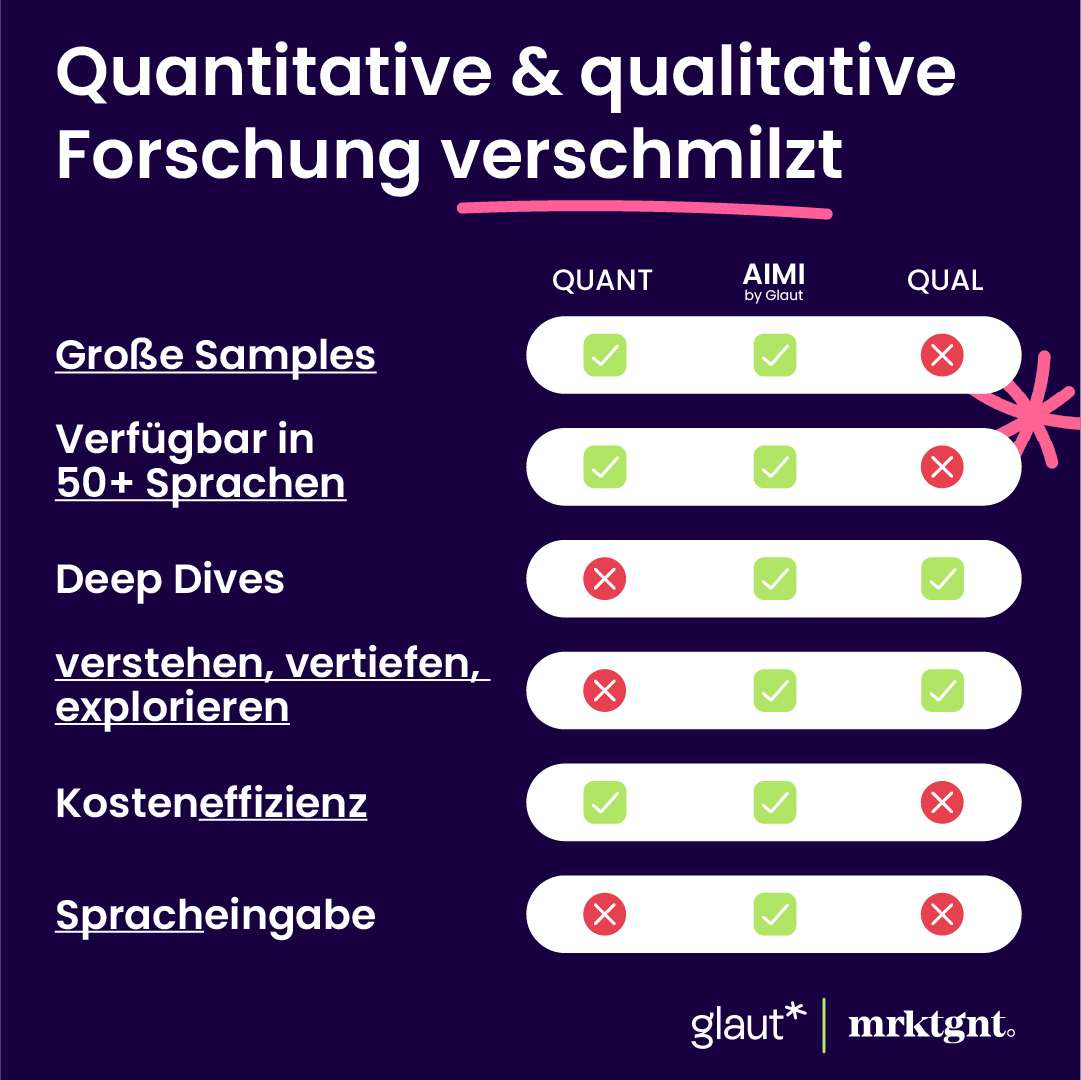Die KI-gestützte Software ermöglicht eine völlig neue Art der hybriden Forschung, indem sie strukturierte Online-Umfragen mit dynamischen, KI-moderierten Tiefeninterviews (AIMI) kombiniert. So ergeben sich ganz neue Forschungsmöglichkeiten, die bis dato undenkbar waren. Im Rahmen einer klassischen quantitativen Online-Umfrage können mithilfe von Glaut KI-moderierte 1-zu-1-Interviews ergänzt werden. Dank intelligenter Gesprächsführung passt die KI die Fragen in Echtzeit an, vertieft relevante Themen und ermöglicht so eine authentische, nuancierte Datenerhebung – in großem Maßstab, mit beispielloser Geschwindigkeit und in über 50 Sprachen. Dieses nie dagewesene hybride Forschungsdesign löst erstmals den Knoten zwischen qualitativer und quantitativer Marktforschung auf, verbindet die Vorteile beider Ansätze und setzt so einen neuen Standard in der Marktforschung.