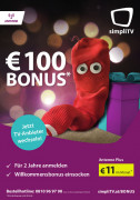 simpliTV-Neukunden, die das Antenne Plus Paket erwerben, erhalten einen 100 Euro Willkommensbonus, und bezahlen so für das erste Jahr Fernsehen mit simpliTV nur 56 Euro und im zweiten Jahr 121 Euro. Mehr als 40 Sender, die beliebtesten davon in HD, lassen sich mit diesem Paket einfach, flexibel und unkompliziert empfangen. Zusätzlich steht kostenloses Streaming von acht Sendern zur Verfügung. Die Aktion ist bis 31. Dezember 2018 bei Neuanmeldung eines simpliTV-Pakets Antenne Plus mit zwei Jahren Mindestvertragsdauer auf Basis einer Jahresrechnung gültig.