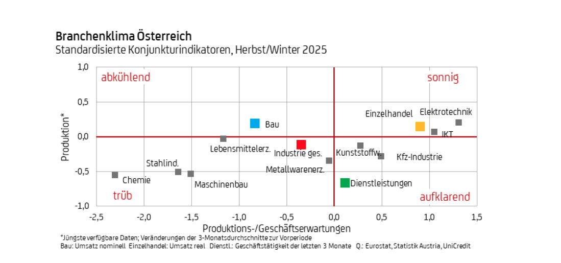 Die Stimmungsaufhellung im vierten Quartal lässt eine Fortsetzung des leichten Rückenwinds für die heimische Wirtschaft erwarten. Das Branchenklima ist aktuell in den meisten Sektoren trüb oder abkühlend, eine Verbesserung kündigt sich vor allem im Handel und in Teilen des Dienstleistungssektors an.