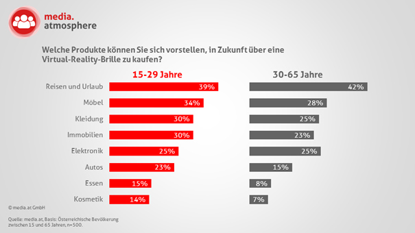 WIEN. Laut der Studienreihe media.atmosphere der Mediaagentur media.at können sich 59% bereits vorstellen, in Zukunft ausgewählte Produkte über eine Virtual Reality-Brille zu kaufen. Befragt wurden 500 Personen zwischen 15 und 65 Jahren. Virtual Reality (VR) hat insgesamt bereits einen hohen Zuspruch: Jeder Zweite interessiert sich sehr oder eher für die Technologie. Interessant ist vor allem, dass mehr als die Hälfte der 15- bis 65-Jährigen der Ansicht ist, dass die VR-Technologie die Zukunft stark verändern wird; 22% gehen von einer sehr starken Veränderung aus. 19% der 15- bis 65-Jährigen haben eine Virtual Reality-Brille mindestens einmal ausprobiert. Im Alters- und Geschlechtervergleich zeigt sich, dass die Jungen und Männer die Nase vorn haben. Dem Kauf steht der Großteil der Befragten jedoch skeptisch gegenüber; als Gründe werden in erster Linie ein zu hoher Preis genannt und dass die Technologie noch zu wenig ausgereift sei.