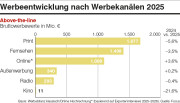 Im Bereich Above-the-line (ATL; Print, TV, Online, OOH, Radio und Kino) ist das Werbevolumen auf 4,83 Mrd. gesunken, was einem Rückgang von 2,3% im Vergleich zu 2024 entspricht.
