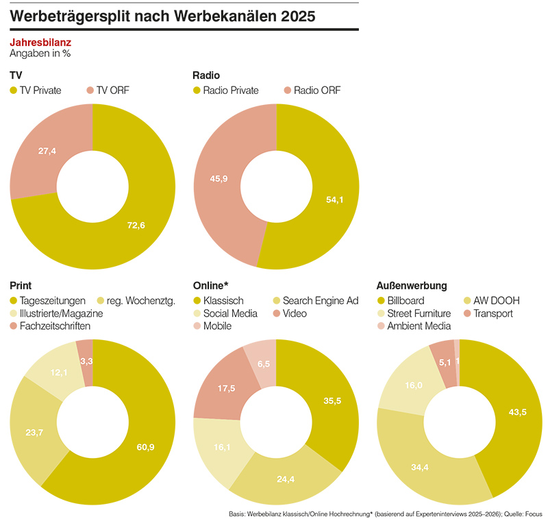 Am Ende der Tabelle reihen sich öffentliche Institutionen ein. Den Werberückgang von rund 44 Mio. € erklärt Focus dadurch, dass es 2025 keine größeren Wahlen in Österreich gab. Auch Telekommunikation verzeichnete ein absolutes Werbeminus von über 21 Mio. €, zurückzuführen vor allem auf den deutlichen Werberückgang von Spusu, der Mobilfunkmarke der Mass Response Service GmbH. Auch bei Handel, Möbel und Einrichtung schlägt sich der Wegfall von Kika/Leiner deutlich nieder und führt im Vergleich zu 2024 zu einem Werberückgang von gut 18 Mio. €.