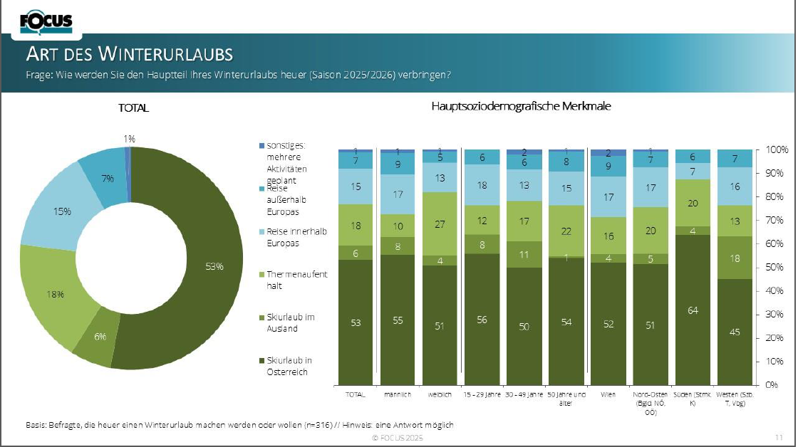 Über die Hälfte der Befragten plant einen Skiurlaub in Österreich, rund 6 % möchten ins Ausland reisen. Etwa 18 % der Befragten bevorzugen einen Thermenurlaub, 15 % reisen innerhalb Europas und 8 % außerhalb. Thermenaufenthalte sind häufiger bei Frauen und nehmen mit zunehmendem Alter zu.