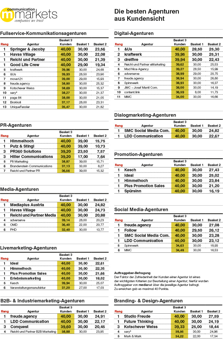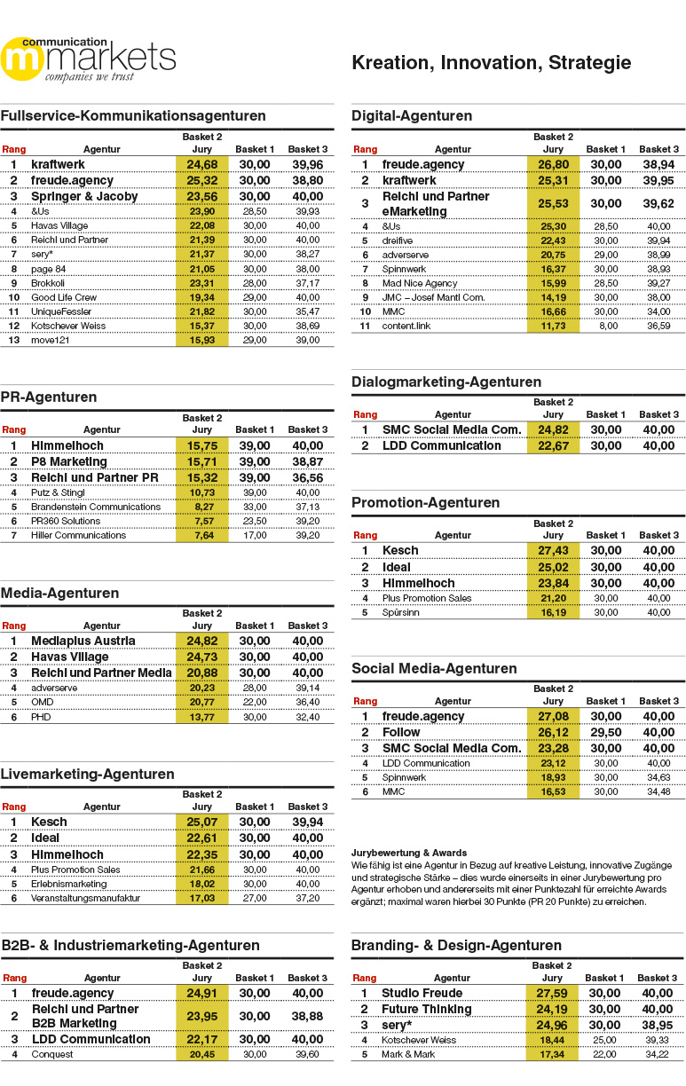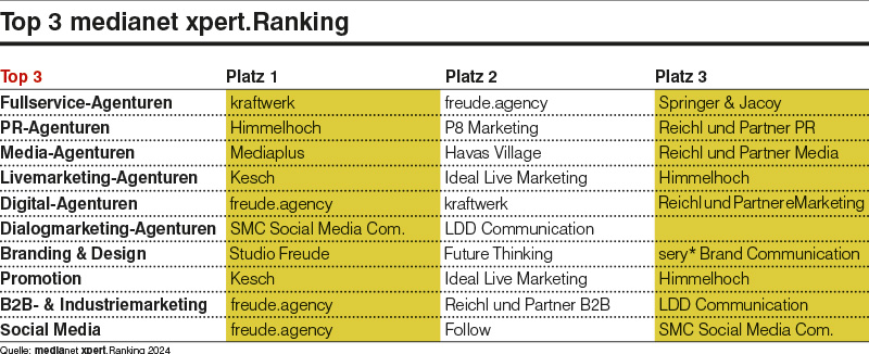 Seit zehn Jahren zeichnen die medianet xpert.Rankings nun schon die leistungsstärksten Agenturen des Landes aus und bieten damit Orientierung – für medianet -Herausgeber Oliver Jonke von Beginn an eine Erfolgsgeschichte: „Schon ab dem Start vor zehn Jahren waren die xpert.Rankings das relevanteste Nachschlagewerk für Agentur-Auftraggeber.“ Der Blick auf die Ergebnisse offenbart wieder zahlreiche bekannte Gesichter. Bei den Fullservice-Agenturen konnte sich kraftwerk durchsetzen. Beste PR-Agentur ist wie in den vergangenen Jahren Himmelhoch, bei den Media-Agenturen holt sich erneut Mediaplus Gold. Kesch schafft es mit Livemarketing und Promotion gleich in zwei Kategorien ganz nach oben. Toppen kann das freude.agency – die Agentur rund um die beiden Geschäftsführer Markus Wieser und Alexander Hofmann kommt bei den Digital-Agenturen und in den beiden neuen Kategorien B2B- & Industriemarketing sowie Social Media auf den ersten Platz. SMC wird wie im Vorjahr beste Dialogmarketing-Agentur, und Studio Freude kann sich erneut in der Kategorie Branding & Design durchsetzen.