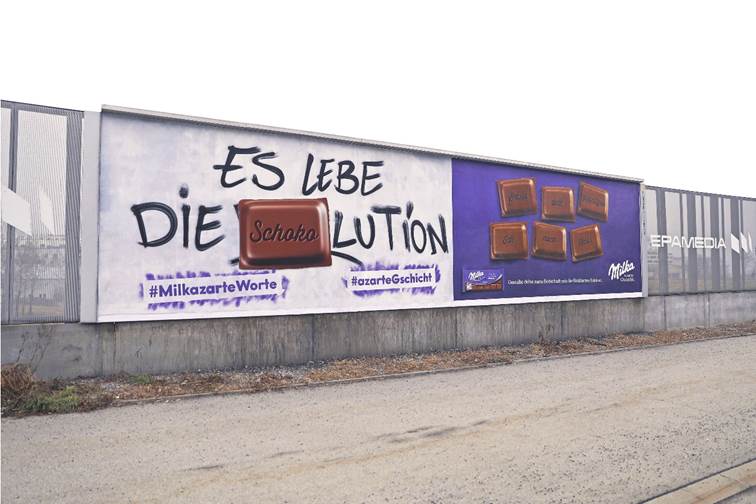 Um diese Botschaft effektiv einer breiten Öffentlichkeit bekannt zu machen, setzt Milka zum wiederholten Mal auf Außenwerbung. Mit über 800 Plakaten in ganz Österreich wird auf die limitierte Schoko-Edition und ihre „zarte“ Botschaft aufmerksam gemacht. Die kreativen Köpfe von Wavemaker und D&K Brand Activation haben sich aber nicht nur die Plakatkampagne einfallen lassen, sondern auch eine ganz besondere Aktion dazu erdacht: Auf ausgewählten Standorten in Wien wurden weiße Plakatwände neben den aktuellen Milka-Sujets mit negativen Aussagen, die allzu oft zu hören sind, besprüht. Diese Sprüche wurden jedoch nur für kurze Zeit so stehen gelassen: Bei einer Nacht-und-Nebel-Aktion wurden die Graffitis in der Folge mit zarten Worten überklebt – ganz nach der Devise, das Böse mit Gutem bekämpfen. Auf diese Art wird der Fokus der Betrachter und Passanten umso stärker auf die positive Botschaft gelenkt.