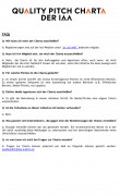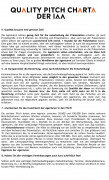 Begonnen wird mit Empfehlungen zur Auswahl von Kreativagenturen bei Etats, die nicht dem Vergaberecht unterliegen. In weiterer Folge soll das Angebot jedoch auch um Pitches, die dem Vergaberecht unterliegen, erweitert werden und sich auch gezielt Ausschreibungen in anderen Bereichen wie zum Beispiel Media widmen. Sowohl Auftraggeber als auch Agenturen, die den IAA Quality Pitch unterstützen, verpflichten sich, keine Etats auszuschreiben, bzw. nicht an Ausschreibungen teilzunehmen, die der "Quality Pitch Charta" der IAA widersprechen. Zudem sind Agenturen angehalten, freiwillige Mehrleistungen – über das verlangte Maß hinaus – zu vermeiden.