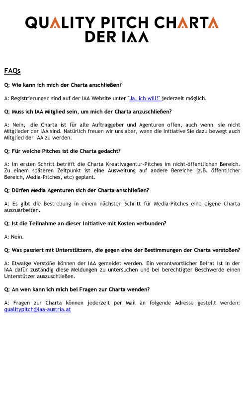 „Wir freuen uns, dass wir mit vielen namhaften Agenturvertretern, dem Österreichischen Verband der Markenartikelindustrie, der die Interessen vieler Auftraggeber vertritt, der Fachgruppe Werbung der Wirtschaftskammer Österreich und zahlreichen anderen Branchenexperten und Unternehmen zu dieser Übereinkunft gekommen sind. Ziel der IAA ist es immer, die Qualität in der Kommunikationsbranche zu erhöhen. Wir hoffen mit dieser Initiative vor allem einen Beitrag zu besserer Kommunikation und darüber hinaus einen wichtigen Beitrag zur Verbesserung der Pitchkultur in Österreich zu leisten“, erklärt Sebastian Bayer, IAA Austria Chapter Vizepräsident und CEO von VMLY&R Vienna.