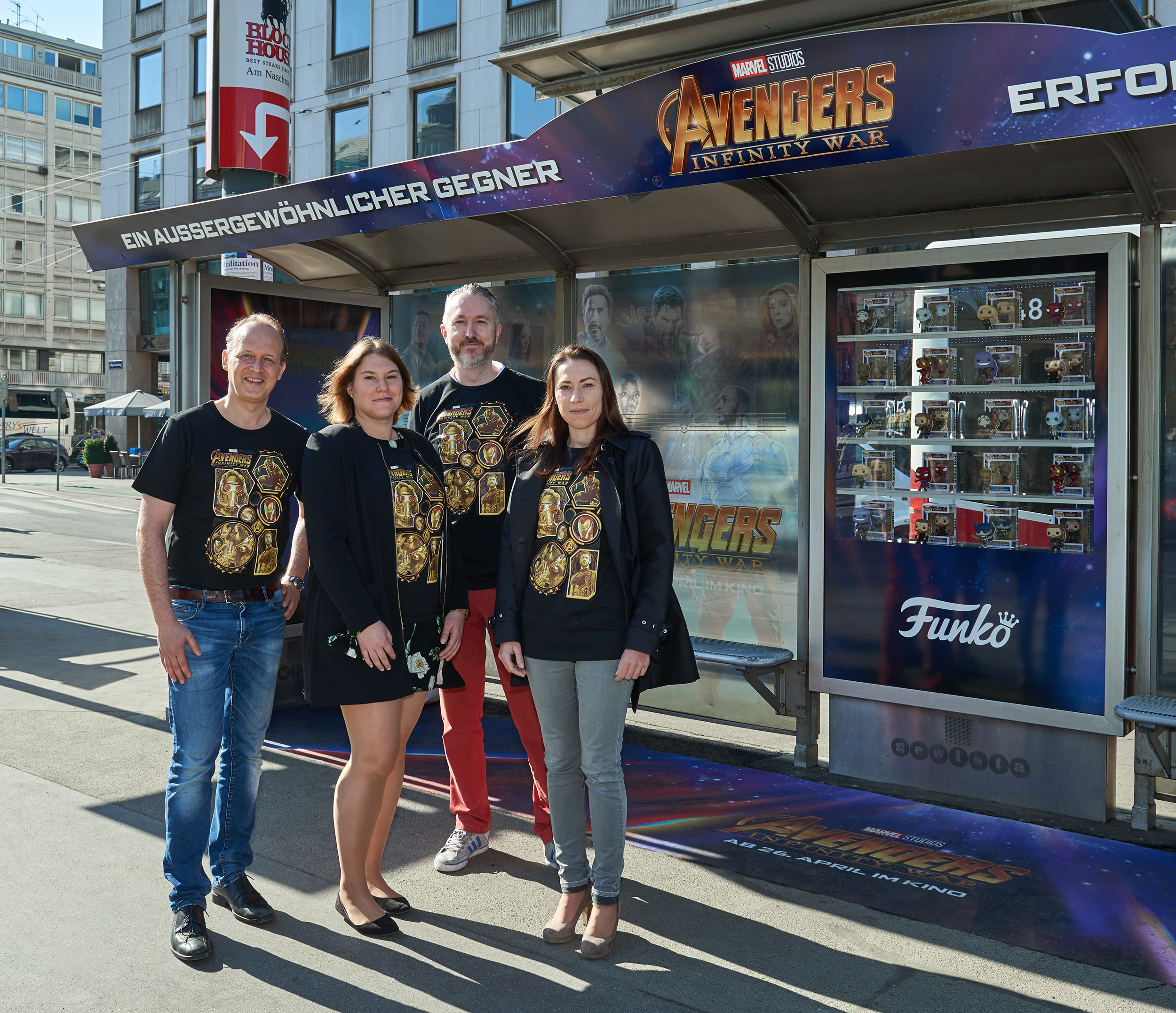 WIEN. Im hoch erwarteten neuen Blockbuster von Marvel, "Avengers: Infinity War", der am 26. April in unseren Kinos startet, ist die geballte Helden-Power des Marvel Cinematic Universe erforderlich, um gemeinsam in der größten aller Schlachten gegen den übermächtigen Thanos zu bestehen. Ein außergewöhnlicher Gegner erfordert ein außergewöhnliches Team! Deswegen war es naheliegend, dass zur Bewerbung dieses epischen Superheldenfilms auch außergewöhnlich geballte Werbemaßnahmen gefragt sind. Deshalb werden seit Kurzem „Iron Man“, „Thor“, „Captain America“, „Black Widow“ & Co an zwei reichweitenstarken Standorten direkt am Wiener Opernring via Wartehallen-Totalbranding eindrucksvoll in Szene gesetzt. Im ästhetischen Out-of-Home-Mix kommen auch Digitale City Lights zum Einsatz.