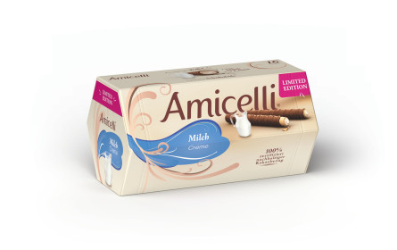 Bereits im vergangenen Herbst erfreute sich die Milch Creme-Edition von Amicelli großer Beliebtheit: Die Kombination aus knusprigen Waffelröllchen und Milch Creme wurde schnell zum Publikumsliebling – besonders bei den jüngeren Konsument:innen. Jetzt gibt es die Sorte erneut für kurze Zeit als 200-Gramm-Packung mit jeweils 16 Röllchen.