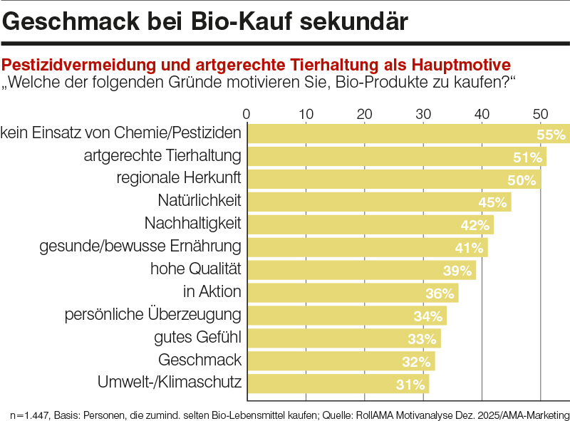 Eine ergänzende Motivanalyse vom Dezember 2025 unter mehr als 1.500 Befragten ging den Einstellungen zu Bio-Lebensmitteln auf den Grund. Mehr als die Hälfte konsumiert der Studie zufolge mindestens einmal in der Woche Bioprodukte, 15% so gut wie täglich, ein Drittel mehrmals wöchentlich. Die Motivatoren für den Biokauf sind vielfältig: In erster Linie zählt, dass Bio-Lebensmittel frei von Chemie und Pestiziden sind und natürlich produziert werden, eine fast ebenso große Rolle spielt die artgerechte Tierhaltung. Geschmack und Umweltschutz spielen indes für zwei Drittel der Befragten eine nur untergeordnete Rolle (siehe Grafik).
