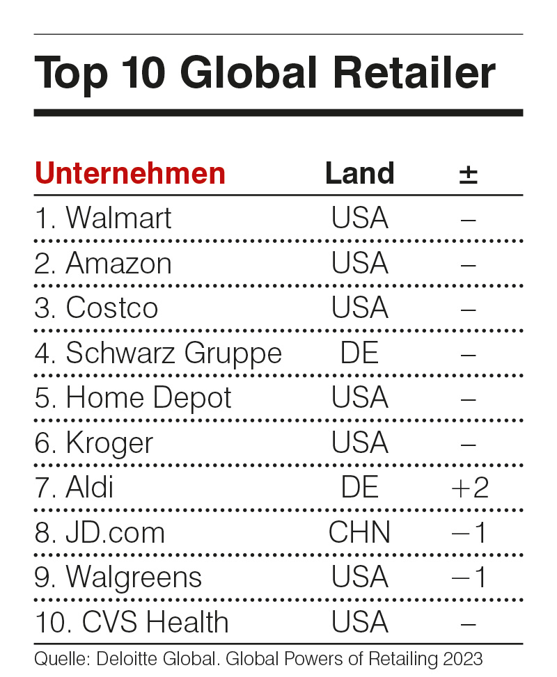 Die Top 3 des globalen Einzelhandels bleiben weiterhin fest in US-amerikanischer Hand: Walmart nimmt mit einem Umsatz von 648,1 Mrd. USD (ca. 571 Mrd. €) unverändert die Spitzenposition im Deloitte-Ranking ein. Dahinter folgen – ebenfalls wie in den Vorjahren – Amazon mit 251,9 Mrd. USD (222 Mrd. €) und Costco mit 242,3 Mrd. USD (213 Mrd. €).