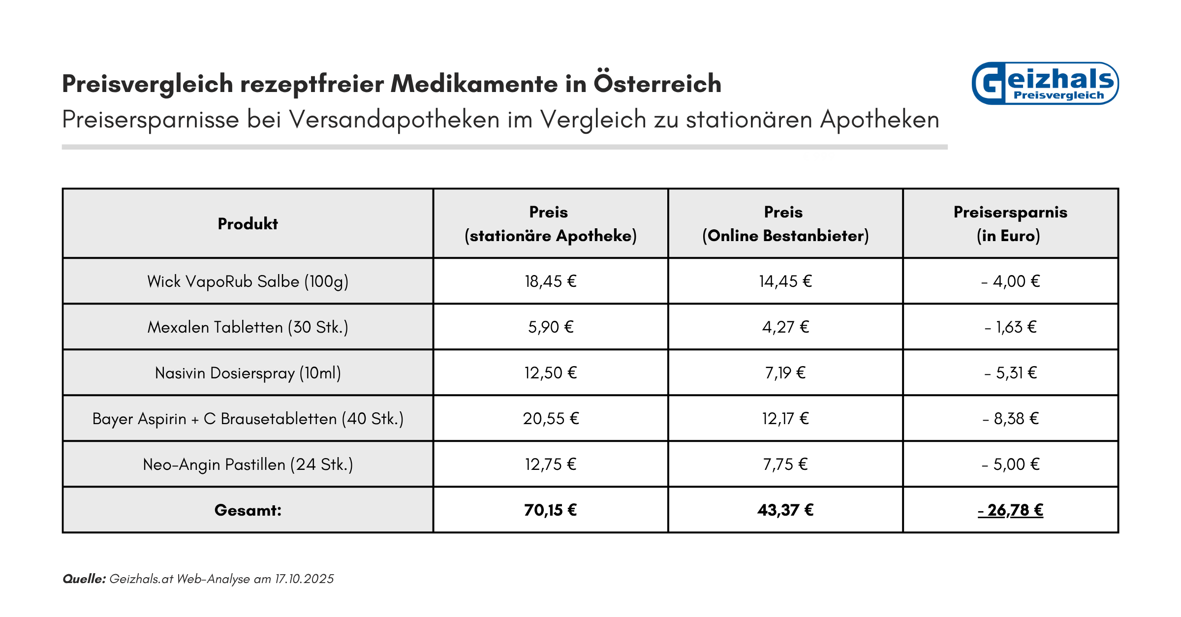 Für die Analyse wurden die Preise von fünf stark nachgefragten Erkältungsmedikamenten in einer Wiener Apotheke gekauft und mit den Bestpreisen der auf Geizhals.at gelisteten Versandapotheken verglichen. Während die Gesamtrechnung in der stationären Apotheke in Wien-Ottakring ganze 70,15 Euro ausmachte, waren dieselben Produkte online um in Summe um nur 43,37 Euro erhältlich. Dies entspricht einer Ersparnis von 26,78 Euro bzw. 38 Prozent.