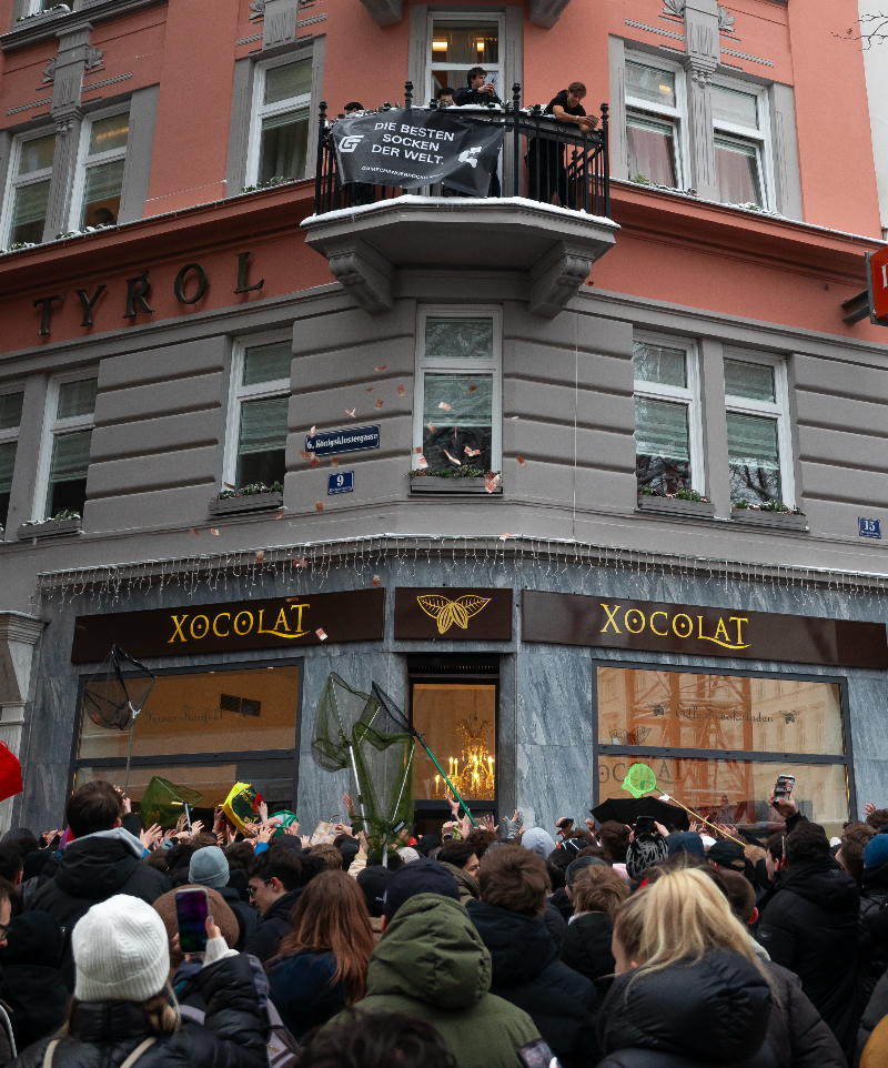 WIEN. Am Freitag den 20.02.2026 um 16h erreichte die in den vergangenen Tagen intensiv angekündigte Kampagne von @gamechangersocks ihren Höhepunkt. Von einem Balkon auf der Mariahilferstraße warf @gamechangers socks Gründer Max Weißenböck insgesamt 10.000 Euro in 10-Euro-Scheinen in die versammelte Menge. Zahlreiche Menschen hatten sich nach kurzfristiger Bekanntgabe des Standorts über die Social-Media-Kanäle der Marke eingefunden. Medienvertreterinnen und -vertreter, Influencer sowie Livestreamer begleiteten die Aktion vor Ort und übertrugen sie digital.