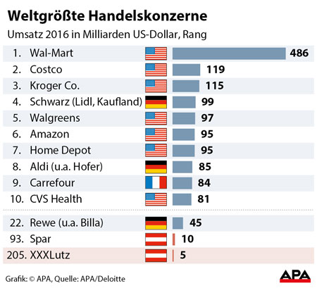 WIEN. Mit dem Salzburger Lebensmittelhändler Spar und der Welser Möbelhandelsgruppe XXXLutz zählen auch zwei österreichische Firmen zu den Top-250-Einzelhandelsunternehmen der Welt, wie aus dem Deloitte-Report "Global Powers of Retailing" hervorgeht. Mit einem Umsatz von 10,5 Mrd. USD (8,65 Mrd. €) liegt Spar in diesem Ranking auf Platz 93 (davor 95), XXXLutz kommt mit 4,6 Mrd. USD (3,79 Mrd. €) auf Platz 205 (davor 204). Basis der Erhebung war der Umsatz im Finanzjahr 2016. "Österreichs Einzelhandel kann im harten internationalen Wettbewerb erfolgreich bestehen. Die Steigerung von Spar ist besonders erfreulich und ein schönes Beispiel für das große Potenzial unserer heimischen Unternehmen", so Orsolya Hegedüs von Deloitte Österreich. An der Spitze hat sich gegenüber dem letzten Report nichts verändert – sieben der zehn umsatzstärksten Unternehmen im Einzelhandel haben ihren Sitz in den USA: Mit einem Umsatz von fast 486 Mrd. USD liegt Wal-Mart erneut auf Platz 1; der US-Konzern erwirtschaftete vier Mal so viel Umsatz wie die zweitplatzierte Costco Corporation mit 118,7 Mrd. USD. Der Gesamtumsatz der globalen Top-250 ist 2016 um rund vier Prozent auf 4,4 Billionen USD gestiegen. (red/APA)