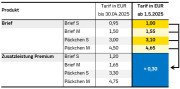 Ab 1. Mai beträgt der Preis für das kleinste Brief-Format, den „Brief S“, 1 Euro. Die Zusatzleistung „Premium“ kostet – für alle Formate – 30 Cent und kann mit anderen Zusatzleistungen wie z.B. „Einschreiben“ kombiniert werden.