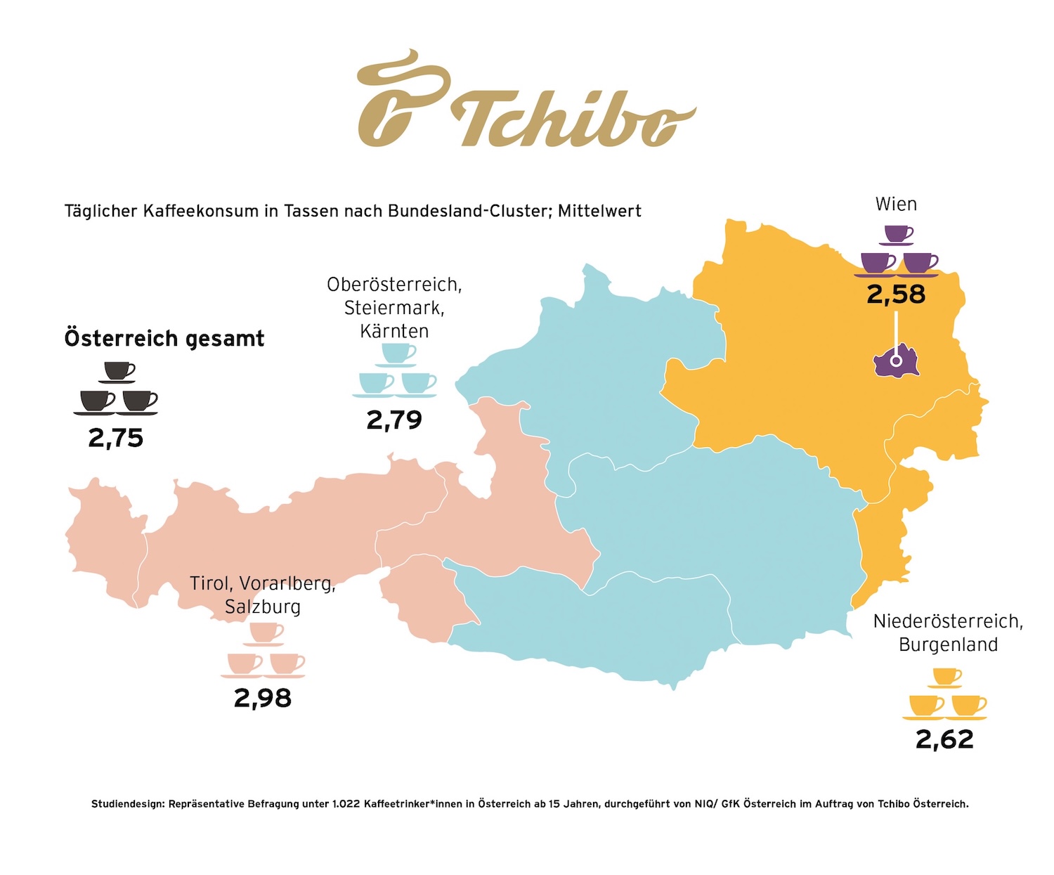 Westen hat die Nase vorn: Tirol/Vorarlberg/Salzburg führt mit 2,98 Tassen pro Tag.