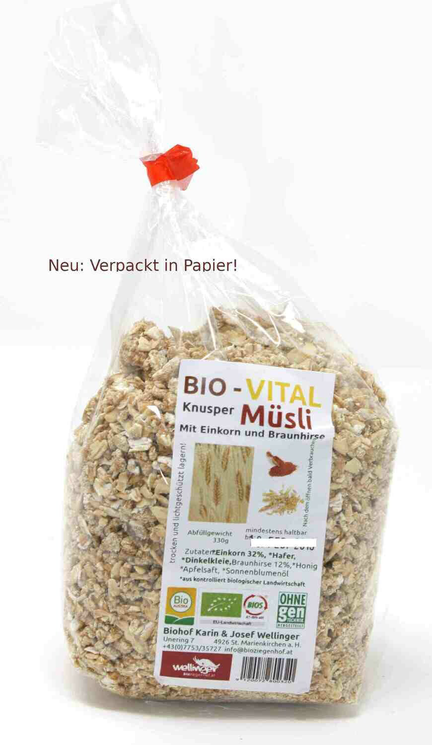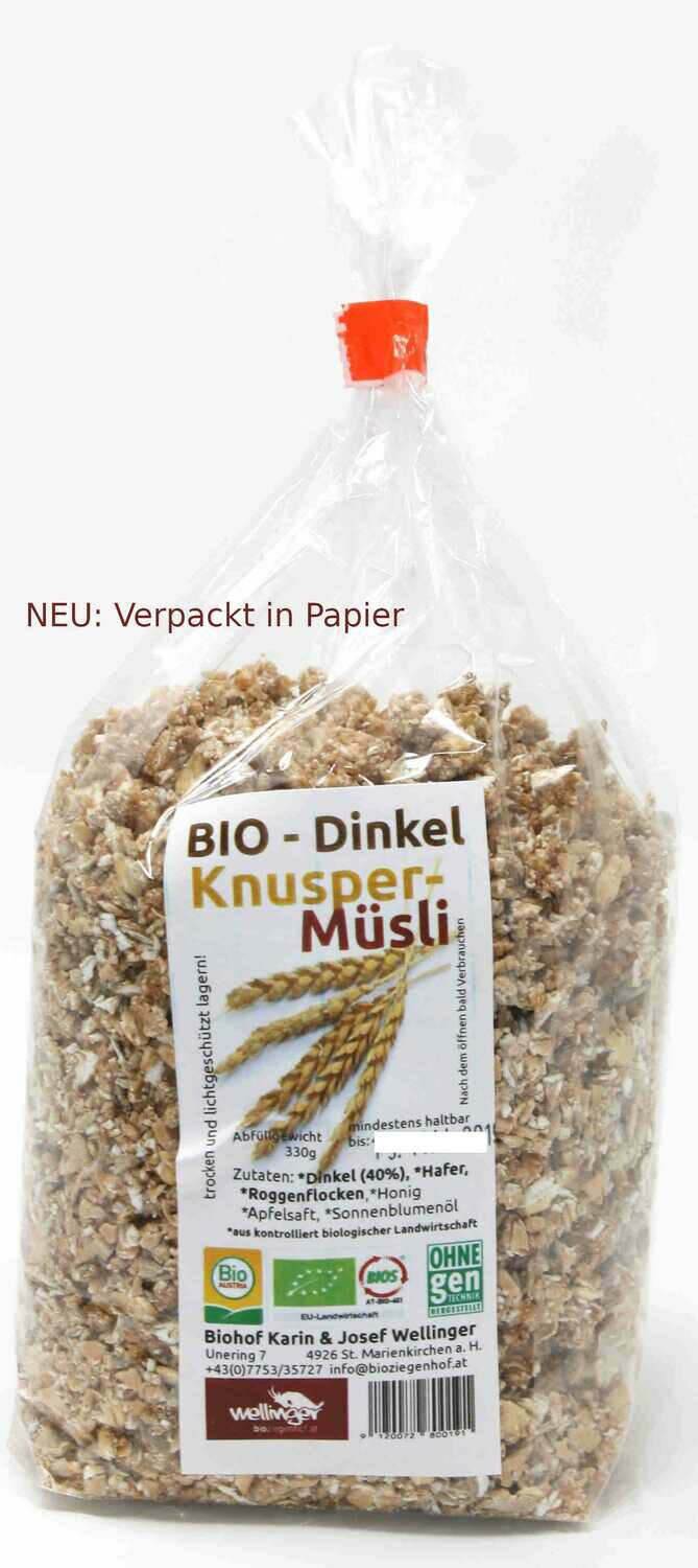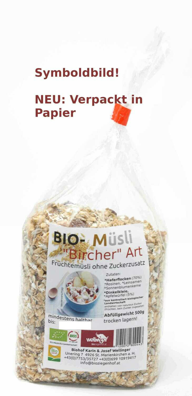 Wir verpacken Ihr Müsli in den gewünschten Bestellmengen in PAPIER (Blockbodenbeutel mit Sichtfenster (0,5-2Kg))